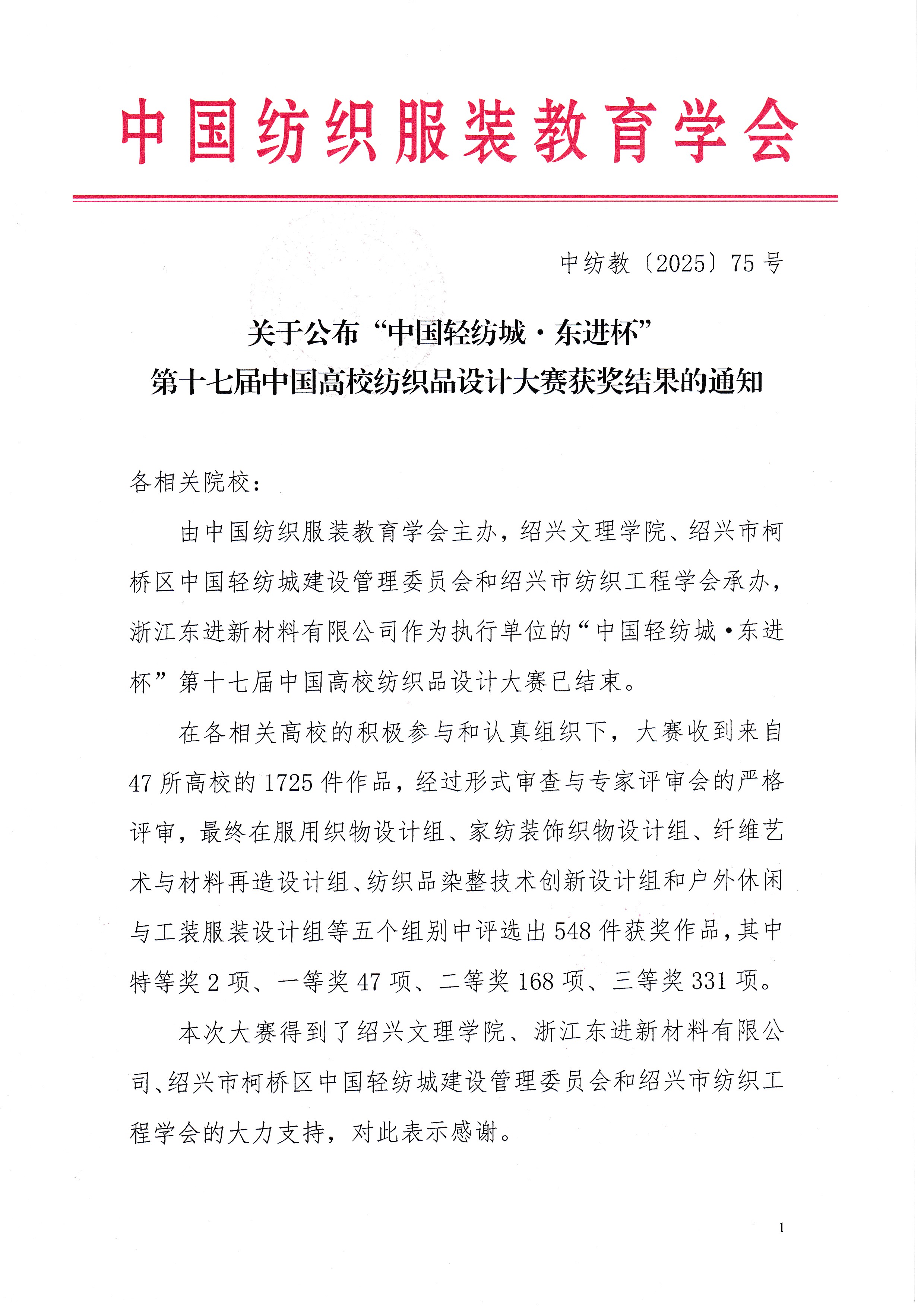 关于公布“中国轻纺城·东进杯”第十七届中国高校纺织品设计大赛获奖结果的通知