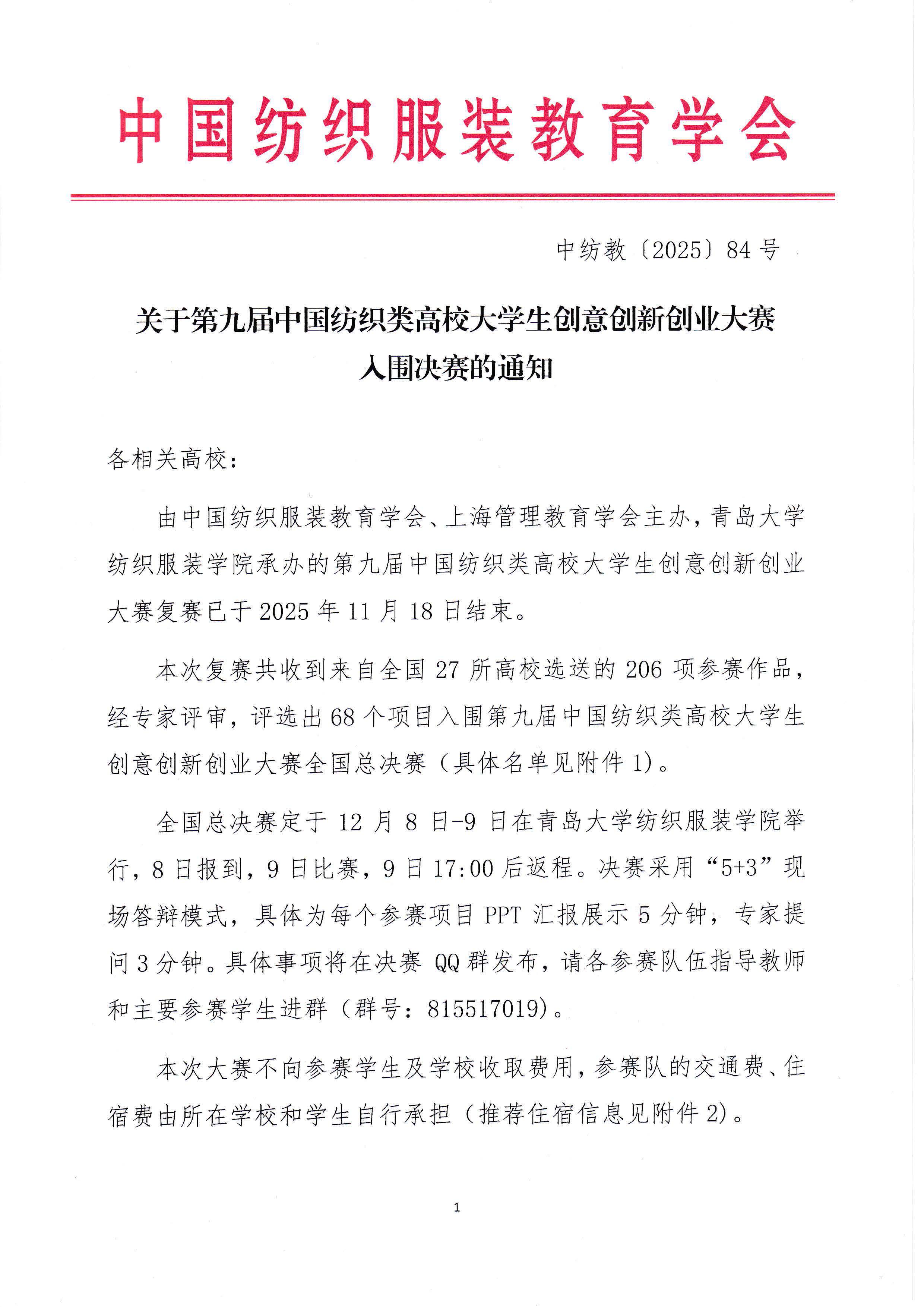 关于第九届中国纺织类高校大学生创意创新创业大赛入围决赛的通知