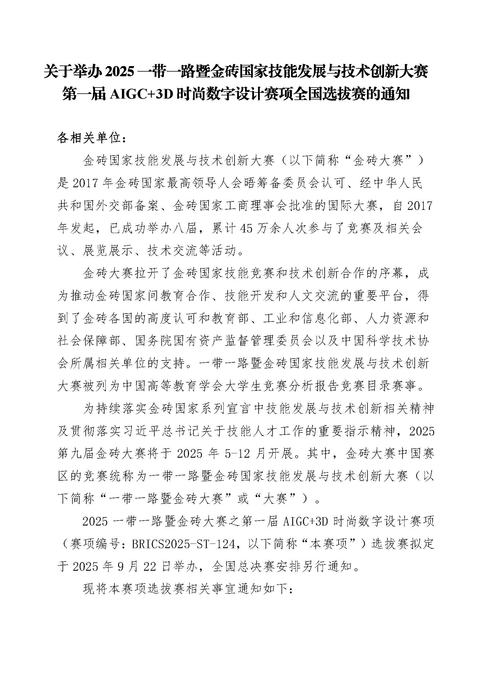 关于举办2025一带一路暨金砖国家技能发展与技术创新大赛第一届AIGC+3D时尚数字设计赛项全国选拔赛的通知