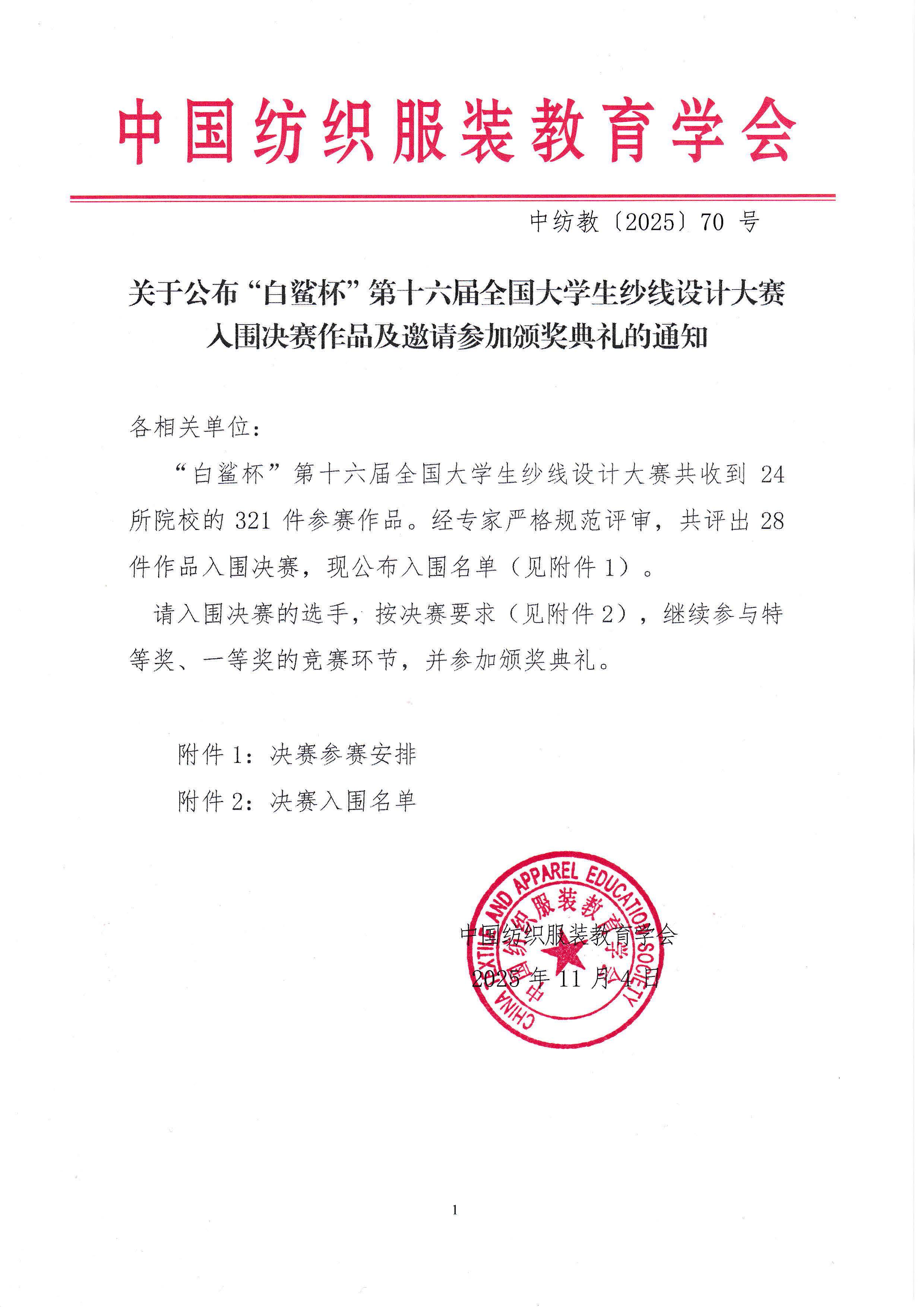 关于公布“白鲨杯”第十六届全国大学生纱线设计大赛入围决赛作品及邀请参加颁奖典礼的通知