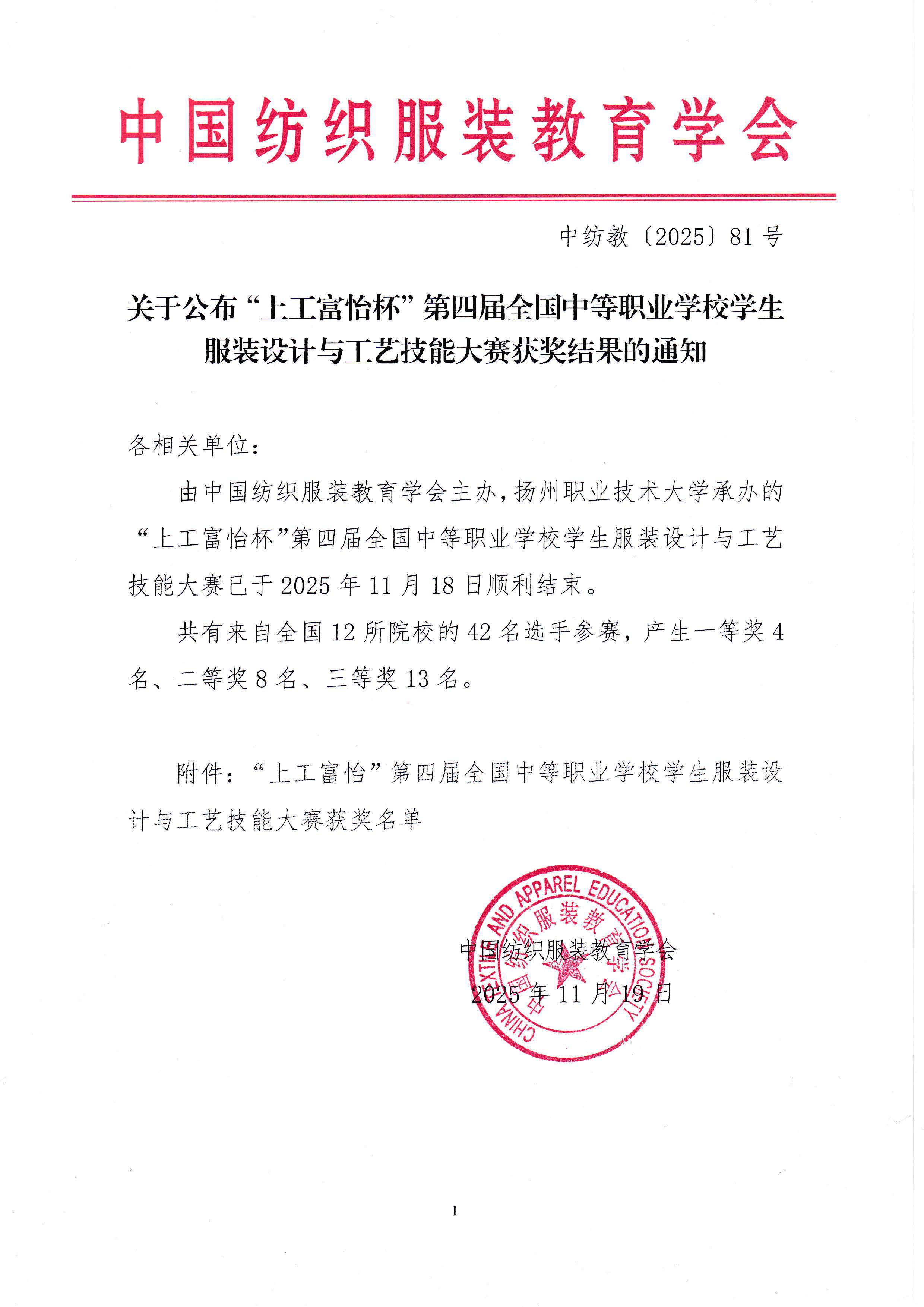 关于公布“上工富怡杯”第四届全国中等职业学校学生服装设计与工艺技能大赛获奖结果的通知