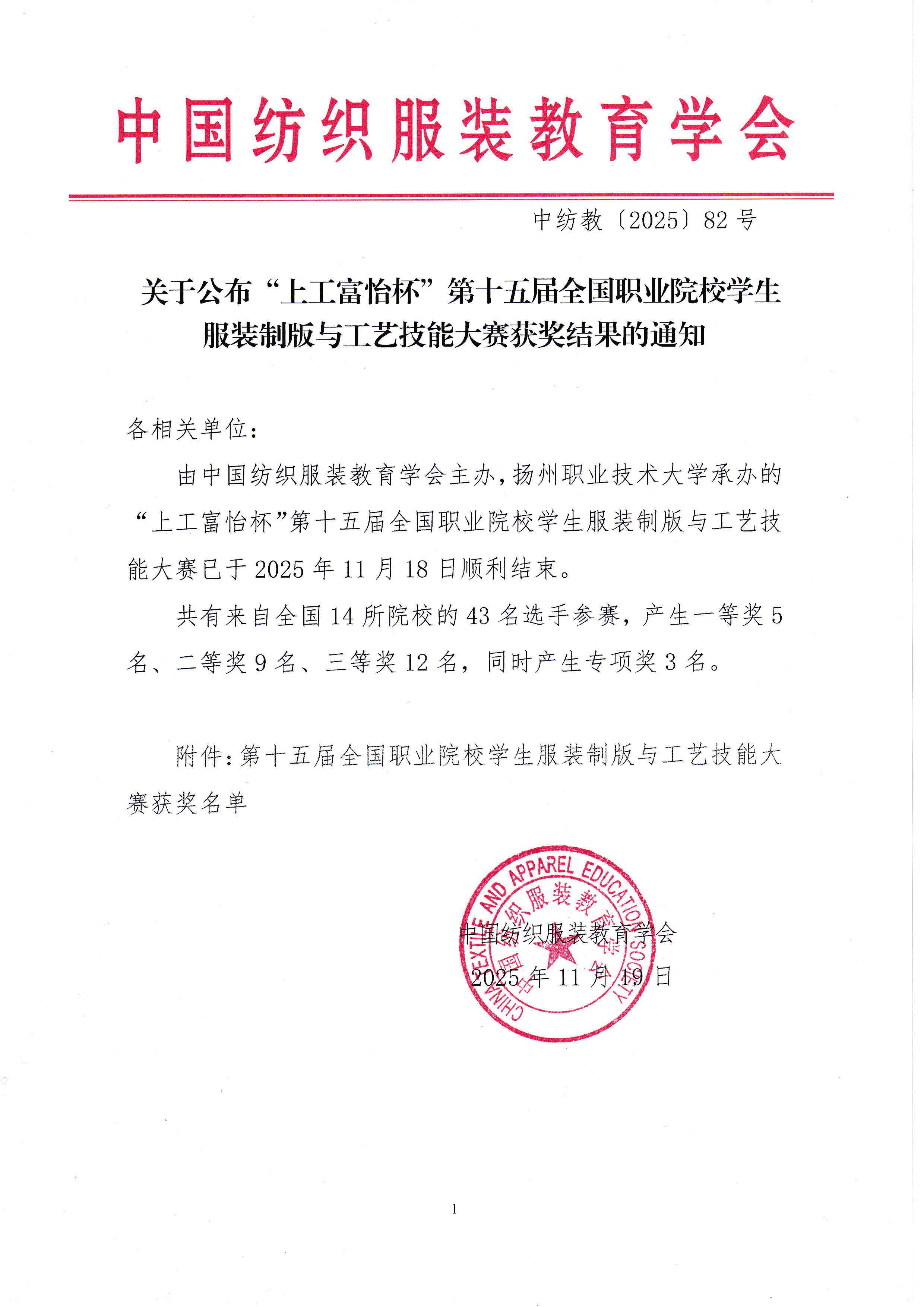 关于公布“上工富怡杯”第十五届全国职业院校学生服装制版与工艺技能大赛获奖结果的通知